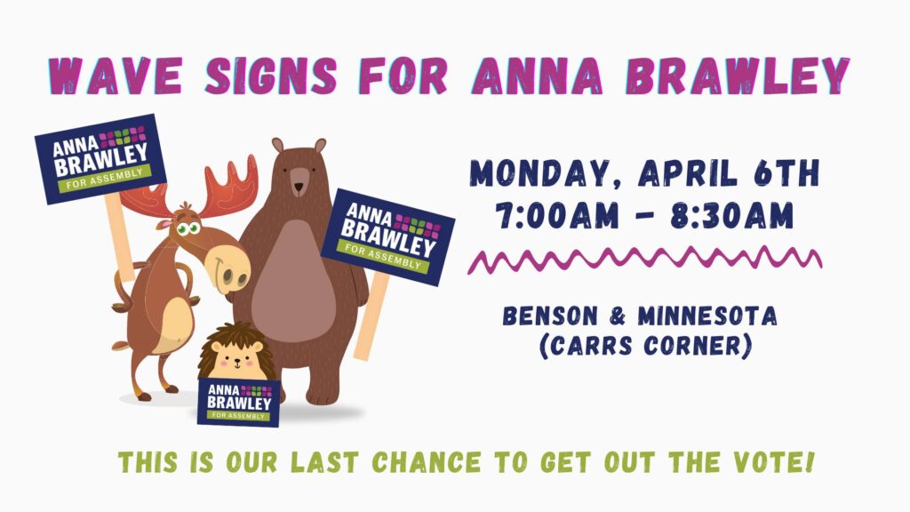 Sign waving alone doesn’t win elections, but it shows strong support – and Anna needs you to show up Monday and Tuesday!