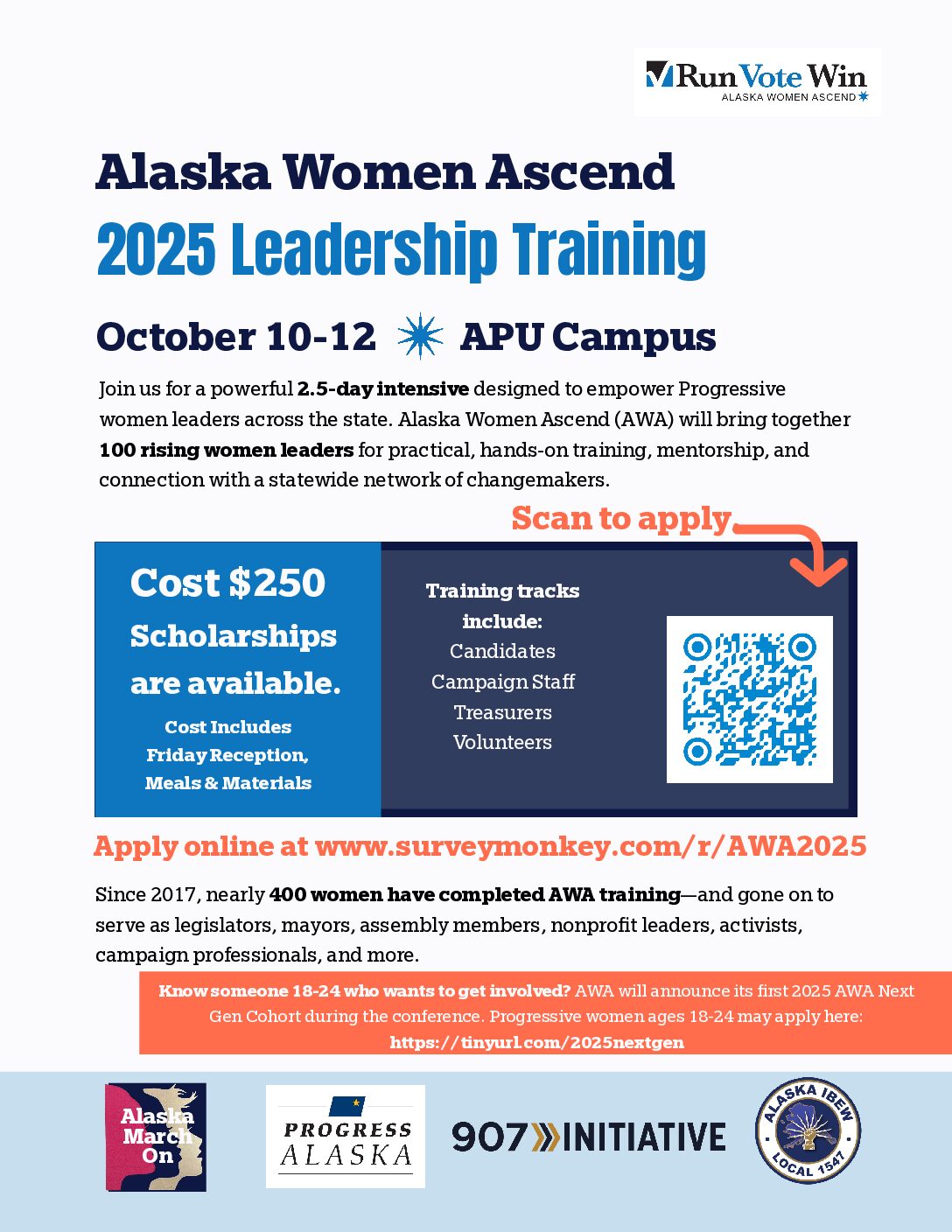 This year, Alaska Women Ascend (AWA) is hosting a statewide leadership training that prepares progressive women across Alaska to run, lead, and win. The event will be October 10–12, 2025, […]